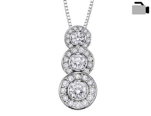 Three 14 karat white circles each with a diamond in the center and surrounded by additional diamonds make this sparkling treasure a true pendant to behold. This is it the right gift you know she will fall in love with. View product video below main image. SKU: 02CC1927100W